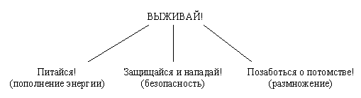 Таким образом, на высоких уровнях организации живого – имеются в виду разумные уровни(10) – мы имеем структурно тот же набор команд в составе команды “Выживай!”, но качественно он иной, более глобальный по содержанию, ибо предполагает: