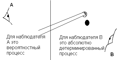 Рис. 1 Иллюстрация того как процесс кажется детерминированным или вероятностным в зависимости от положения наблюдателя.