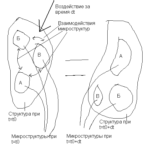времени t0 + воздействия на эту структуру( которые все заранее предопределены) за момент времени dt + самоизменение структуры за то же время( которое можно свести к воздействию друг на друга не самоизменяющихся структур более простого порядка). Иллюстрацию этого процесса можно увидеть на рис. 2. А кем был человек в момент за 9 месяцев до рождения? Группой молекул! Но в момент времени от зачатия до времени взросления все воздействия были предопределенны, поэтому заранее было ясно какая личность из него получится. А если ясно, какая личность будет, то ясно, как она поступит и в ответ на следующее воздействие. А это уже не свобода. Таким образом человек думает, что поступает как он хочет, а на деле уже миллион лет назад можно было предсказать как он поступит в данной ситуации. Тут конечно можно возразить, что если человек будет действовать и если смирится со своей судьбой, то результат будет разной, но и это возражение не проходит т.к. уже заранее ясно будет ли действовать человек и как будет. И также предопределенно опустит ли руки прочитавший книгу по фатализму человек, или продолжит свою жизнь в том же духе, что и прежде или наперекор этому учению станет действовать активнее, чем прежде. В общем, выводы получаются, мягко говоря, безрадостными и посему, конечно же, хочется возразить этой теории. Поэтому нет никакой неожиданности в том, что возражения появились, начиная от опубликования данной теории.