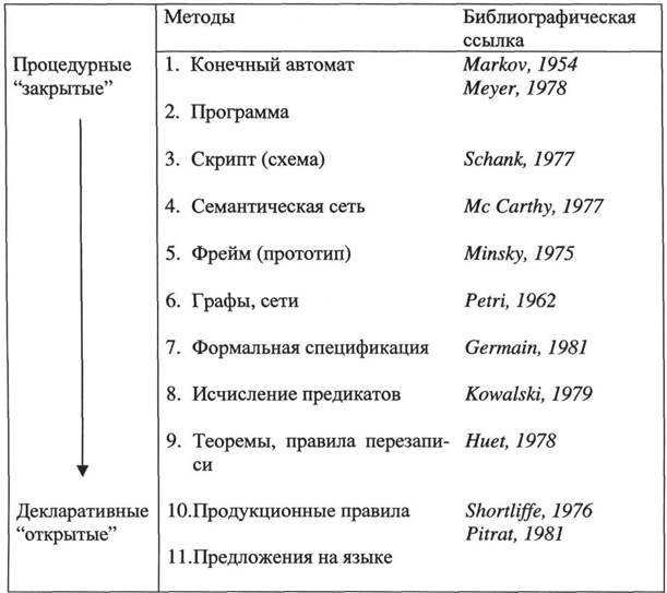 Приведем краткий список наиболее распространенных в настоящее время методов. Фундаментальное различие между ними состоит в простоте модификации знания. В таблице ниже они приведены в порядке от наиболее процедурного (наиболее застывшего, структурированного) до наиболее декларативного (наиболее открытого, свободного, неупорядоченного) Такая классификация является несколько грубой, но правильно: отражает идею.