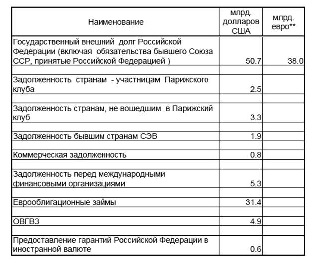 По данным Минфина, на 1 января 2003 года, объем государственного внешнего долга составил – 122,1 млрд. долл. (по предварительным оценкам на 1 апреля 2003 г. снизился примерно до 120 млрд), причем около 46% составляют долги бывшего СССР. Общий объем платежей РФ по внешнему долгу в 2003 г. составил около 17,3 млрд. долл. Объем государственного внешнего долга России, по данным Минфина, к 1 января 2004 г. составил 126,8 млрд., к 2005 г. – 122,7 млрд., к 2006 г. – 113,3 млрд. долларов.