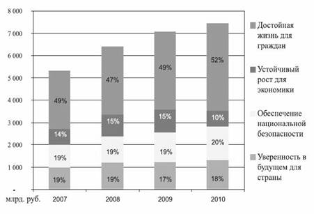 Бюджет 2008–2010 годов направлен на повышение уровня жизни населения и выполнение всех обязательств перед гражданами, поддержку стратегических и инновационных отраслей, обеспечение безопасности, создание потенциала для устойчивого развития страны (рис 2.1).