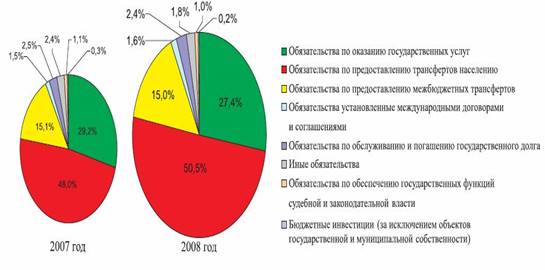 Основное место в реестре занимают обязательства по предоставлению трансфертов населению, включающие публичные расходные обязательства и стипендии, которые являются «прямыми» финансовыми обязательствами государства перед гражданами (пенсии, пособия, компенсации, иные социальные гарантии) и подлежат безусловному исполнению. В 2008 году такие обязательства составляют более 50% от общего объема расходных обязательств Российской Федерации (рис. 2.2).