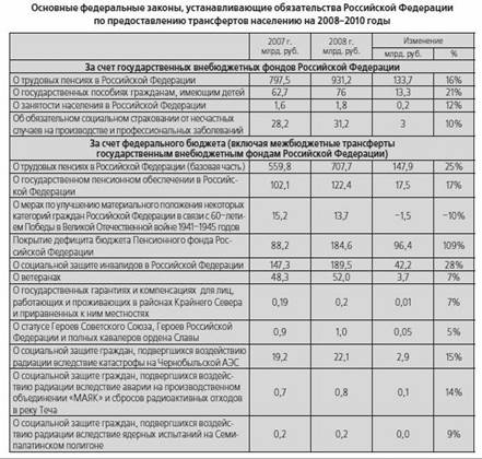 При подготовке федерального бюджета на 2008 год и на период до 2010 года использовался реестр расходных обязательств Российской Федерации на 2008–2010 годы, представляющий собой «инвентаризацию» правовых оснований и методов расчетов всех включаемых в федеральный бюджет и бюджеты государственных внебюджетных фондов Российской Федерации расходов.