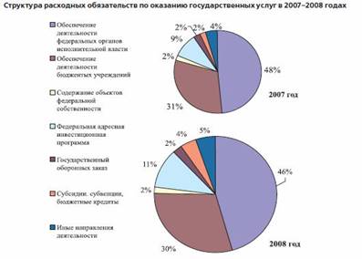 В структуре расходных обязательств, подлежащих исполнению за счет федерального бюджета, основное место занимают обязательства по оказанию государственных услуг.