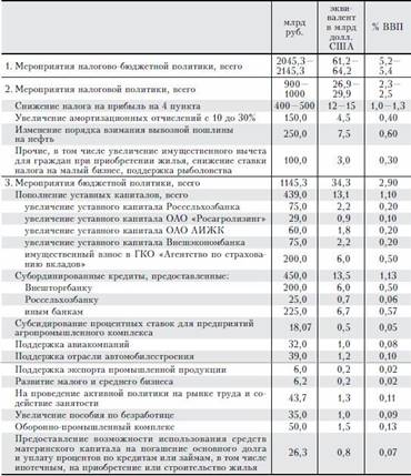 В таблице 4 представлен набор мероприятий налогово-бюджетной политики, направленных на преодоление последствий мирового финансового кризиса в нашей стране. Общая стоимость мер налоговой политики оценивается на уровне 900—1000 млрд. руб. (2,3—2,5% ВВП), мер бюджетной политики (без размещения средств суверенных фондов) — в 1145 млрд руб. (2,9% ВВП). Таким образом, суммарный объем антикризисных мер составляет 2045—2145 млрд. руб. (5,2—5,4% ВВП).