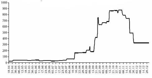На начальном этапе для поддержки банковской ликвидности Минфин России размещал свободные средства федерального бюджета на депозитах коммерческих банков (см. рис. 10). Кроме того, в 2008 г. на внутреннем финансовом рынке были размещены средства ГК «Фонд ЖКХ» (180 млрд. руб.), ГК «Роснано» (130 млрд руб.), а также Фонда национального благосостояния (175 млрд. руб.).