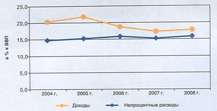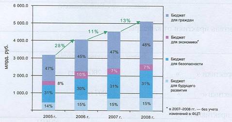 Общий объем непроцентных (не связанных с обслуживанием долга) расходов федерального бюджета в реальном выражении (с учетом инфляции) в 2006 году по сравнению с 2005 годом увеличился на 15%, а в 2008 году — на 27% (рис. 4).