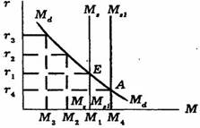 Кривая предложения имеет вертикальный вид тогда, когда центральный банк реализует цель поддержания количества денег на постоянном уровне и уверенно контролирует количество денег в обращении независимо от колебания процентной ставки. Такая ситуация характерна для жесткой монетарной политики, направленной на сдерживание инфляции. Для этого используются такие инструменты, как изменение нормы обязательных резервов и операции на открытом рынке.