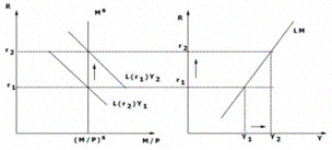 Увеличение Y с Y1 до Y2 увеличивает равновесную процентную ставку с r1 до r2, для того, чтобы поддерживать равновесие на денежном рынке при более высоком уровне дохода. Точки (r1,Y1) и (r2,Y2) определяют положение кривой LM: