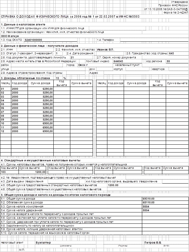 Рассмотрим расчёт НДФЛ на примере Иванова В.П. Иванов В.П. ежемесячно получает в ООО «Магнум» заработную плату: в январе 6290 руб., в феврале 5290 руб., в марте 5290 руб. Следовательно, в справке 2-НДФЛ в поле «январь» должны вписать 6290 руб., в поле «январь-февраль» 11580 руб. (6290 руб.+5290 руб.) и так далее. Доход Иванова В.П., исчисленный с начала года по данному предприятию превысил 20000 руб. в апреле. Так как стандартный налоговый вычет действует до месяца, в котором доход, исчисленный нарастающим итогом с начала налогового периода превысил 20000 руб. Следовательно, начиная с месяца, в котором указанный доход превысил 20000 руб. налоговый вычет не применяется. Иванов В.П. имеет право на ежемесячный стандартный налоговый вычет в размере 400 руб. (400 руб.х3 мес.). Сумма вычета равна 1200 руб. У Иванова В.П. детей нет, поэтому вычет на ребенка в размере 600 руб. применять не будем. Далее рассчитывается общая сумма дохода по месяцам с начала года. Она составляет 69310 руб. (п. 5.2 справки 2-НДФЛ). Чтобы рассчитать облагаемую сумму дохода необходимо от общей суммы дохода вычесть сумму налоговых вычетов (69310 руб.-1200 руб. = 68110 руб.). Исчисленная и удержанная сумма налога составляет 8854 руб. (68110 руб.х13%).