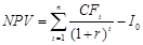 где: r — норма дисконта; n — число периодов реализации проекта; CFt — чистый поток платежей в периоде t. I0—сумма первоначальных затрат, т.е. сумма инвестиций на начало проекта;