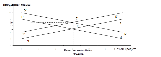 Рассмотрим, как изменения в спросе и предложении повлияют на рыночные процентные ставки. Предположим, что заемщики ожидают увеличение темпа инфляции и снижения реальных издержек заимствования. При данной ставке iе процента спрос на кредит способен превзойти предложение. Кривая спроса на кредит сдвигается вправо, из положения DD в положение D`D` (рисунок 2). Превышение спроса будет оказывать давление в сторону повышения процентной ставки. С другой же стороны предположения кредиторов об увеличении темпов инфляции, т.е. снижению в будущем доходности их активов приведут к снижению предложения кредита при данной ставке процента, что усилит избыточный спрос. Кривая предложения сдвигается влево, в положение S`S`. Часть заемщиков лишается возможности получить кредит, другая часть вынуждена брать кредит по более высокой в сравнению с действующей ставкой процента. В результате на рынке установится новый более высокий уровень процентных ставок i е . При этом равновесный объем кредита в экономике может не измениться по сравнению с предыдущим состоянием рынка.
