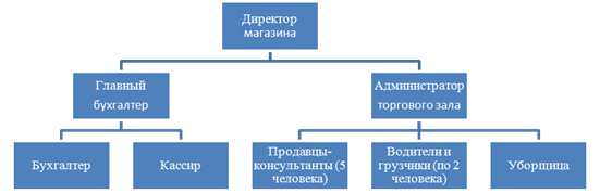Магазин «Эксперт» занимается розничной торговлей. Ассортиментом продаваемых товаров является бытовая и электронная техника, как отечественных, так и зарубежных производителей. Так как магазин открылся недавно у предприятия только начала сформировываться база своих клиентов из города Красноармейска и за его пределами (приезжают покупатели из близлежащих сел Красноармейского района).Этот магазин можно отнести к разряду малого бизнеса. Среднесписочная численность работников на 15 октября 2010 года составляет 15 человек. Исходя из этого, очевидно, что предприятие обладает простой функциональной иерархической структурой (см. рис. 2).