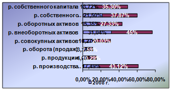 При изучении рентабельности в целом по анализируемому предприятию было выявлено что, наибольшее увеличение темпов роста в 2009 г. по сравнению с прошлым показала рентабельность производства и рентабельность собственного капитала на 25,63% и 21,58% соответственно. Этому способствовало увеличение бухгалтерской прибыли и снижение стоимости основных средств и материально – производственных запасов.