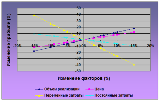 Анализ чувствительности прибыли при изменении анализируемых факторов показывает процентное изменение прибыли при изменении одного из факторов на определенный процент. Так, например, при увеличении объема реализации на 15 % прибыль увеличится на 18 %, а при увеличении постоянных затрат на 10 % прибыль уменьшится на 6,4 %.