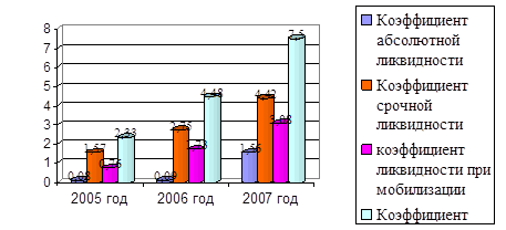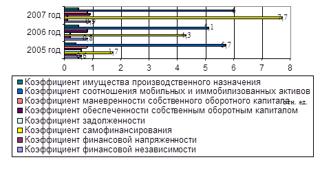 С точки зрения финансовой устойчивости наиболее предпочтительным является 2007 год. Показатель финансовой независимости выше нормативного значения, что свидетельствует об укреплении финансовой независимости предприятия от внешних, снижение риска финансовых затруднений в будущих периодах. Наибольшее значении коэффициента в 2007 году – 0,9; Показатель самофинансирования высок. В 2006 год он составил 1,7, и к 2007 увеличивается до 7,7. Это указывает на возможность покрытия собственным капиталом заемных средств. Таким образом расчет показателей устойчивости подтвердил, что предприятие обладает финансовой самостоятельностью и не находится в зависимости от кредиторов, инвесторов и других источников привлеченных средств.