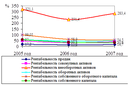 Рентабельность продаж на 2007 год составила 14,7%, т.е. в 2007 году с каждого рубля реализованной продукции предприятие получает 15 копеек прибыли, но наиболее рентабельным является 2005 год, т.к. предприятие получает 17 копеек.