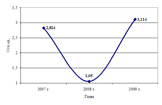 В 2009 г. положение предприятия переместилось в квадрат IV — «Рантье», характеризующийся положительным значением результирующего показателя, достигнутым благодаря резкому увеличению результата хозяйственной деятельности. Положительное значение результата хозяйственной деятельности позволило предприятию инвестировать средства в модернизацию основных фондов. Отказ от использования заемных средств привел к отрицательному значению результата финансовой деятельности.