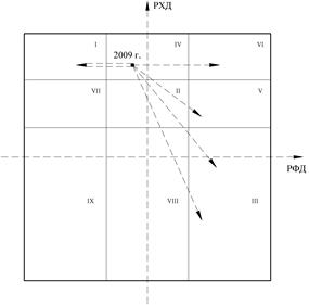 Находясь в квадрате II, предприятие ОАО «ВК и ЭХ» в перспективе может переместиться в квадраты III, V, VIII, I, VII, что отражено на рисунке 17.