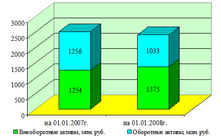По сравнению с 2006 г. произошло увеличение удельного веса внеоборотных активов на 7,14%. Их сумма на конец отчетного периода составила 1375 млн. руб., удельный вес на конец отчетного периода увеличился с 49,64% до 57,1%. Внеоборотные активы на 01.01.2008 г. представлены только основными средствами, их сумма увеличилась на 129 млн. руб., а удельный вес в общей структуре активов увеличился на 7,46%.