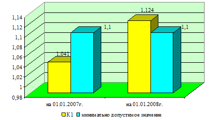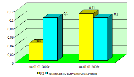 На 01.01.2007 г. значение данного коэффициента ниже нормативного, а на 01.01.2008 г. – выше нормативного. Нижняя граница рекомендуемого значения обусловлена тем, что у предприятия должно быть по меньшей мере достаточно оборотных средств для погашения краткосрочных обязательств, иначе предприятие окажется под угрозой банкротства. Приведенные выше расчеты свидетельствуют о том, что на 01.01.2008 г. РСФ Октябрьского района ОАО «Минскремстрой» обеспечен собственными оборотными средствами для ведения хозяйственной деятельности и своевременного погашения срочных обязательств.