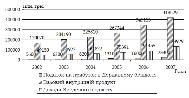 Рис. 1.3. Динаміка ВВП, податку на прибуток підприємств та доходів Зведеного бюджету України