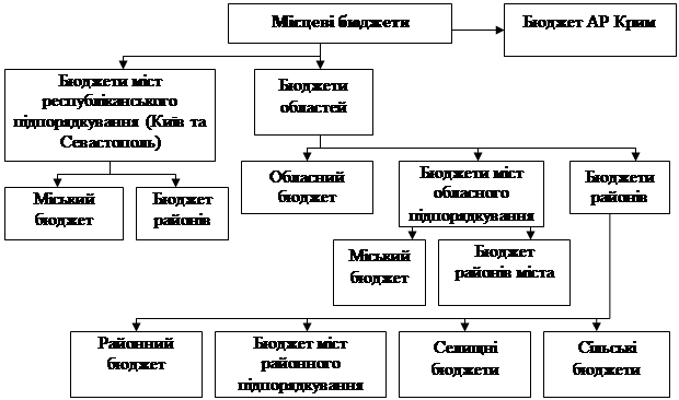 У кожній країні місцеві бюджети є найбільш чисельною ланкою бюджетної системи. В Україні нараховується 12213 місцевих бюджетів, до яких входить: 1- бюджет Автономної Республіки Крим; 2 — бюджети міст Києва і Севастополя, що мають статус міст державного значення; 24 – обласні бюджети; 453 – міських бюджетів; 83 – районні у містах бюджети; 488 – районні бюджети; 887 – селищних бюджетів; 10275 – сільські бюджети.