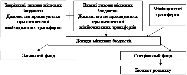 Доходи місцевих бюджетів згідно Бюджетним кодексом поділяються на доходи, що закріплюються за бюджетами місцевого самоврядування та враховуються при визначенні обсягів міжбюджетних трансфертів («закріплені доходи») та доходи, які не враховуються при визначенні обсягів міжбюджетних трансфертів («власні доходи») у дохідній частині місцевого бюджету окремо виділяються доходи, необхідні для виконання делегованих законом повноважень органів виконавчої влади (рис. 3) [3].