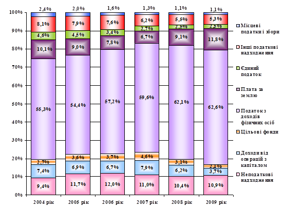 Рис. 4 — Структура доходів місцевих бюджетів у 2004-2009 роках