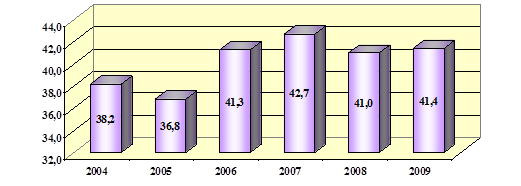 Рис. 5 — Частка видатків місцевих бюджетів у зведеному бюджеті за 2004-2009 роки