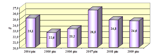 Дохідну частину зведеного бюджету у 2009 році виконано на рівні 88,8 % річного плану (порівняно з 97,3 % у 2008 році), при цьому дохідну місцевих бюджетів – на рівні 90,7 % (97,8 %) [2]. Тенденція до зниження рівня виконання річних планових показників за доходами пов’язана, перш за все, зі зменшенням темпів зростання надходжень до бюджетів усіх рівнів, що, у свою чергу, пояснюється впливом кризових явищ. Частка доходів місцевих бюджетів у структурі зведеного бюджету за аналізований період залишилася майже на рівні 2008 року і склала 24,6 %, скоротившись на 0,2 в. п. (див. рис. 6).