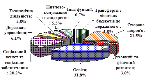 У структурі видатків місцевих бюджетів за функціональною класифікацією порівняно з даними 2008 року найбільші зміни відбулися за видатками на соціальний захист та соціальне забезпечення, частка яких зросла на 2,9 в. п. і становить 20,2 %, та видатками на економічну діяльність, де спостерігається зменшення питомої ваги на 4,6 в. п. до 4,8 %. Частка видатків місцевих бюджетів на житлово-комунальне господарство зменшилась на 1,0 в. п. щодо показника попереднього року і склала 5,3 % [2]. Відбулось зростання часток видатків на охорону здоров’я (на 2,0 в. п. до 21,5 %) та на освіту (на 2,5 в. п. до 31,8 %).