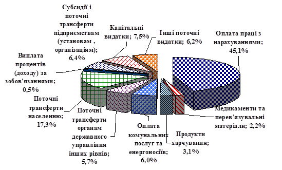Видатки на оплату праці з нарахуваннями традиційно є найбільшими серед усіх видатків місцевих бюджетів і становлять 45,1 %, що на 4,7 в. п. перевищує відповідний показник 2008 року. Також спостерігається збільшення на 2,2 в. п. частки видатків на поточні трансферти населенню (до 17,3 %) та на 1,5 в. п. частки видатків на оплату комунальних послуг та енергоносіїв (до 6,0 %) [2].