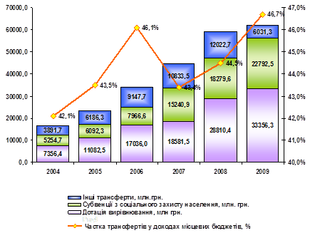 До місцевих бюджетів з державного бюджету протягом 2009 року надійшло 62,2 млрд. грн. міжбюджетних трансфертів (97,8 % річного плану), що більше за обсяги таких надходжень у 2008 році на 5,2 %. Унаслідок цього збільшилася частка міжбюджетних трансфертів у загальній структурі доходів місцевих бюджетів – 46,7 % проти 44,5 % за результатами 2008 року [2].