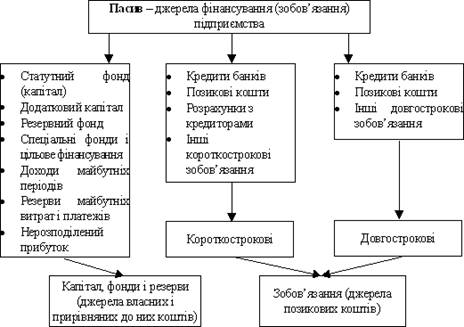 Пасиви підприємства (тобто джерела фінансування його активів) складаються з власного капіталу і резервів, довготермінових зобов'язань, поточних зобов'язань та кредиторської заборгованості. [5]