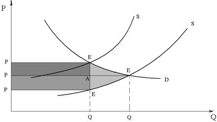 Кривая S (кривая предложения до введения налога) связывает объем предложения с ценой, остающейся у продавца после уплаты налога; S1 – кривая, устанавливающая связь между объемом предложения и ценой, уплачиваемой покупателем, — кривая предложения после введения налога. Кривая S1 получена из кривой S смещением на Т единиц в направлении оси цен (вверх). Введение налога вызвало перемещение равновесия из точки Е0в точку Е1, при этом объем продаж сократился с Q0до Q1, цена, уплачиваемая покупателем, выросла с Р0до P1, а получаемая продавцом — снизилась с Р0до Р1 *. Выгода от покупки-продажи снизилась и для покупателя, и для продавца. Излишек потребителя снизился и из-за того, что за каждую единицу покупаемого товара он вынужден платить больше, и из-за того, что ему при этом приходится сокращать объем потребления, а часть потребителей, возможно, вообще откажется от покупки данного товара. Воспользовавшись геометрическим представлением излишка потребителей, мы можем уменьшение его величины изобразить площадью фигуры P1 E1 E0P0. Продавец получает за каждую единицу товара меньше, чем до введения налога, и к тому же сокращается объем продаж; часть продавцов, возможно, будет вынуждена покинуть данный рынок. Сокращение их излишка представлено на рис. 2 площадью фигуры Р0Е0Е1 *Р1 *. Суммарному сокращению излишков покупателей и продавцов (т.е. величине налогового бремени) соответствует площадь фигуры Р1 Е1 Е0Е1 *Р1 *. Распределению налогового бремени между продавцом и покупателем соответствует отношение площадей фигур P1 E1 АP0 и Р0АЕ1 *Р1 * соответственно. А отношение это, как видно из графика, зависит от наклонов линий спроса и предложения, т.е. от ценовой эластичности спроса и предложения. Площадь треугольной области Е1 Е0Е1 * не покрывается величиной налогового сбора. Это чистые потери общества, обусловленные введением налога.[1, с.61]