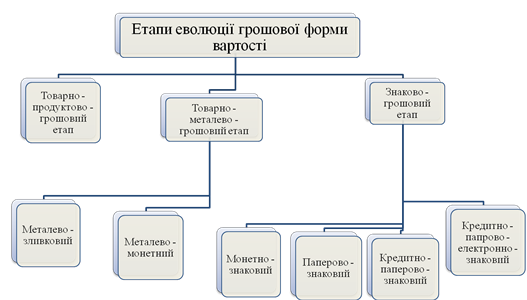 В. Знаково-грошовий етап (а) монетно-знаковий; б) паперово-знаковий; в) кредитно-паперово-знаковий; г) кредитно-паперово-електронно-знаковий).