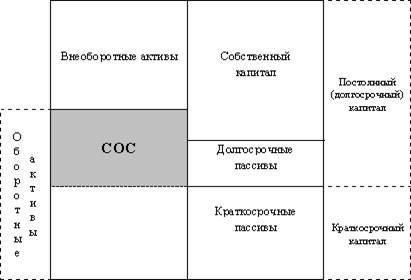 Заштрихованная часть схемы отображает величину имеющихся у предприятия собственных оборотных средств, т.е. той части оборотных активов, которая покрывается как собственным капиталом, так и долгосрочными пассивами, т.е. постоянным капиталом. В мировой практике ещё используются термины рабочий (работающий) или чистый рабочий капитал, величину которого можно рассчитать двумя способами: