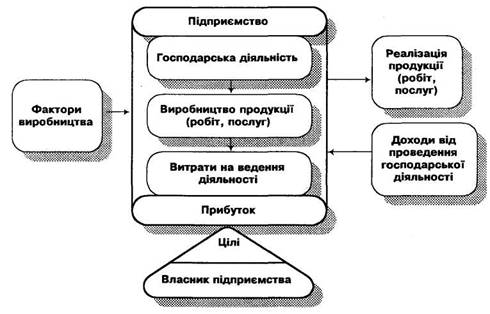 Для здійснення своєї діяльності підприємство має розпоряджатися певними матеріальними, трудовими та фінансовими ресурсами та засобами. Планомірне комбінування та використання цих факторів виробництва, організація виготовлення та реалізації продукції (виконання робіт, надання послуг) є основою для отримання доходу (прибутку), досягнення цілей підприємства та задоволення економічних інтересів його власників (рис. 1.1).