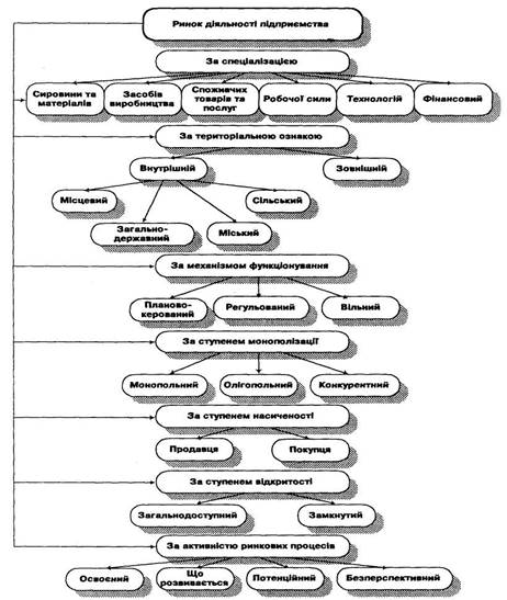 Спеціалізація ринку, на якому функціонує підприємство, визначає предмет його діяльності (виробництво продукції, робіт, послуг), випуск цінних паперів, видача кредитів, розробка технологій та інше).