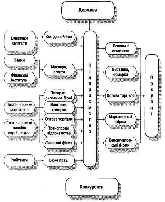 В ході своєї діяльності підприємство взаємодіє не тільки з визначеними ринками, що забезпечують його діяльність та споживають його продукцію (ринок збуту), але й знаходяться під впливом держави та підприємств-конкурентів. Всі вони в сукупності утворюють зовнішнє середовище функціонування підприємства (рис. 1.3).
