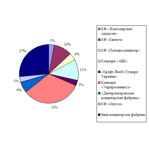 | Продукція | Вага, гр. | ЗАТ «Львівська кондитерська фабрика» | ЗАТ «Харківська бісквітна фабрика» | ВАТ «Крафт Якобз Сушард Україна» | ЗАТ «Київська кондитерська фабрика ім. К. Маркса» | ВАТ «Донецька кондитерська фабрика» |