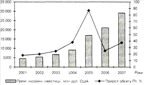 Рис. 2.Динаміка обсягу прямих іноземних інвестицій, 2001—2007 роки