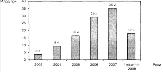 Рис. 3.Обсяг торгів на організаторах торгівлі, 2003 — І півріччя 2008 року
