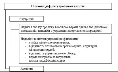 Різноманітні об'єктивні та суб'єктивні причини можуть викликати дефіцит грошових коштів на підприємстві (рис. 1.2), що неминуче призведе до негативних наслідків: