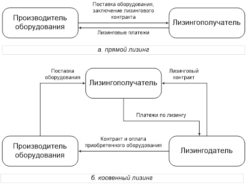 Прямой — после окончания договора, объект лизинга переходит в собственность к лизингополучателю