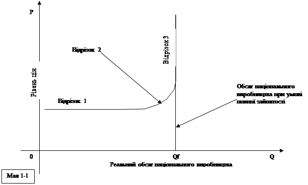 Але відношення між попитом з одної сторони, і обсягом виробництва, зайнятостю і рівнем цін — з другої, набагато складніше, ніж описано зверху. Малюнок 1-1 допоможе зрозуміти вище сказане.
