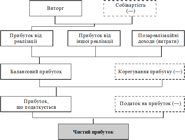 За наведеної схеми бачимо, що основними показниками, які впливають на формування валового та чистого прибутку від операційної діяльності, є сума валового доходу від реалізації продукції, валові витрати виробництва і збуту цієї продукції, амортизаційні відрахування та податкові платежі.