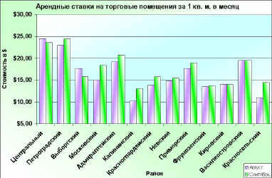 Оживление в розничной торговле и приближающееся 300-летие Петербурга продолжают стимулировать спрос на магазины. По данным агентства «Итака», наиболее популярны помещения от 80 до 200 кв. м. На рынке торговых площадей сохраняется острый дефицит ликвидных объектов. Об этом свидетельствует продолжавшийся в 2002 г. рост арендных ставок и цен на магазины, особенно заметный в центре города. По оценке президента ассоциации «Дар» Дмитрия Прасолова, за год стоимость торговых помещений увеличилась минимум на 40%, а арендные платежи — на 20 — 25%. На рынке все больше инвесторов, готовых вложить свободные средства в покупку магазинов с целью их последующей сдачи в аренду. По данным «Дара», они ориентируются на уровень доходности от 15% до 24% годовых в валюте.